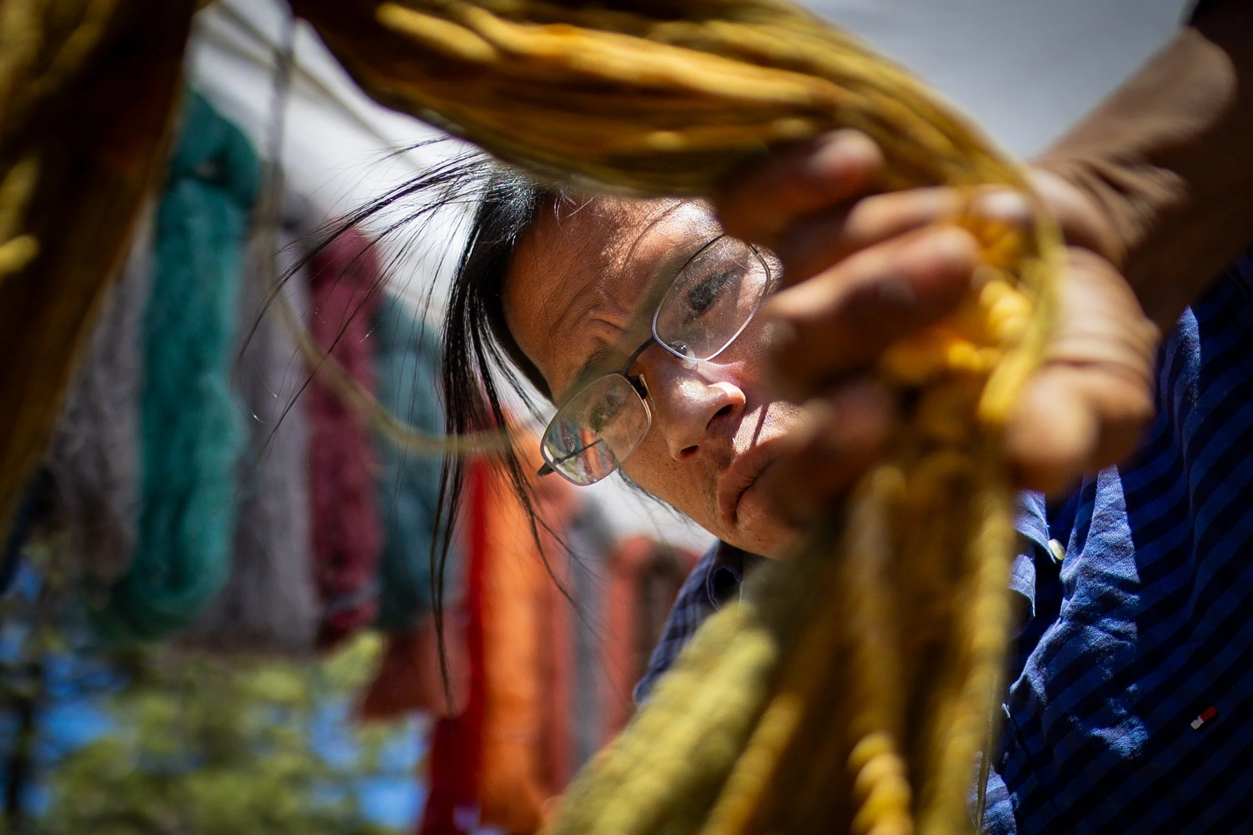 After inspecting the color, the yarn met the sky as Teseny swung it back and forth, like a pendulum. The few water droplets remaining clung to the freshly dyed strand as it hung to dry a few feet above the forest floor.