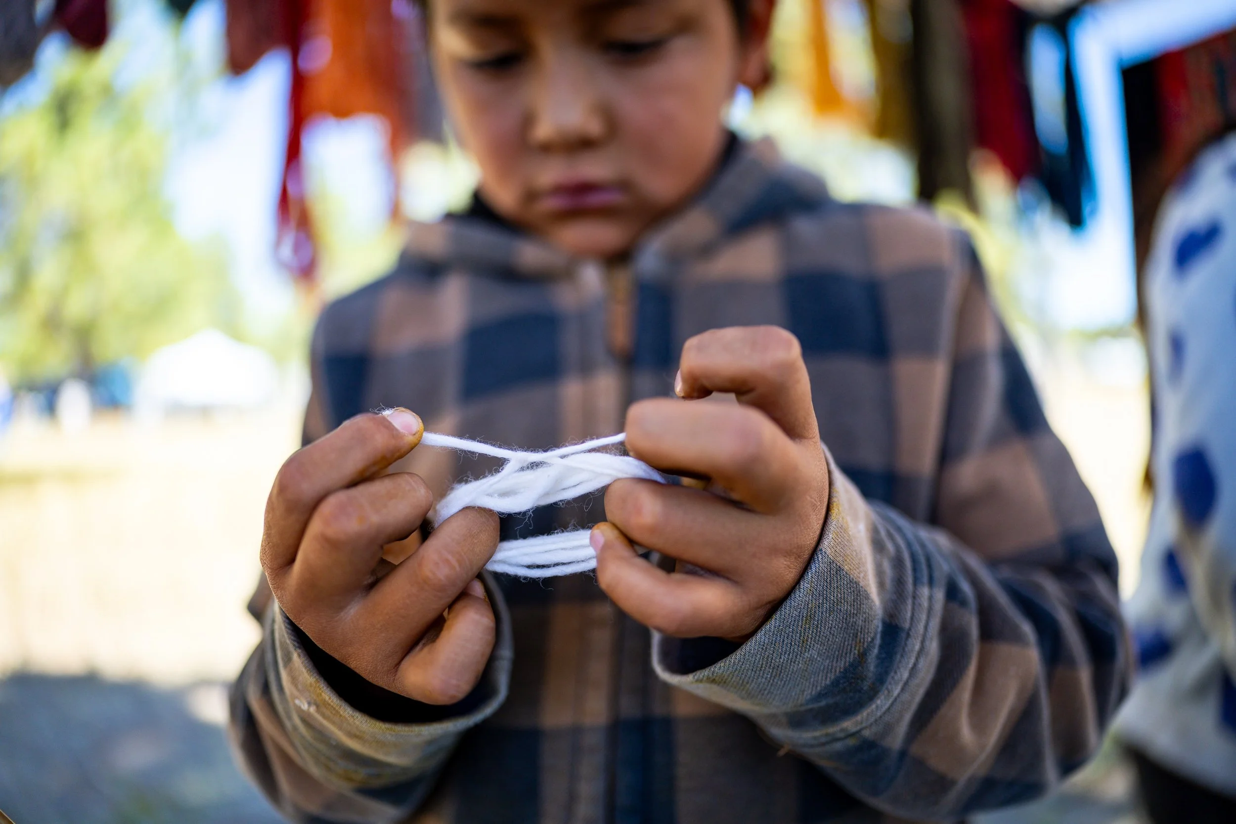 Akaedo Dee, 9, a Navajo boy from Blanding, learns how to work with yarn at a weaving station at the Kagalia Guard Station Campground during the Bears Ears Summer Gathering on Saturday, July 26, 2025. It was Dee’s first time weaving and dyeing yarn.