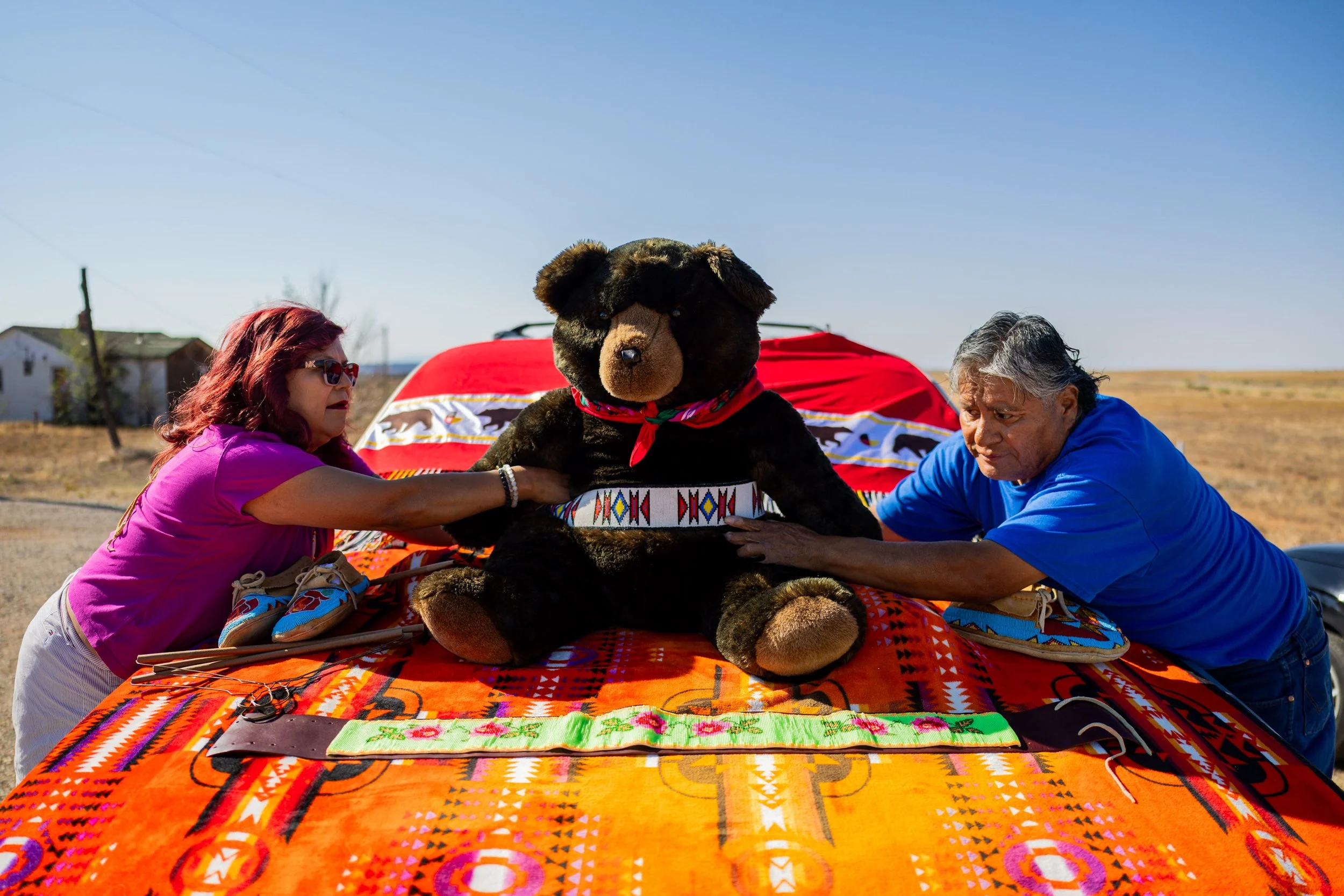 Deena Ute, left, and Elroy Lehi, right, secure a bear atop a car for a parade to celebrate the White Mesa Bear Dance in the White Mesa Ute community, located directly adjacent to the Bears Ears National Monument, on Saturday, Aug. 30, 2025. While it’s rare to see a bear in Bears Ears, they are present, and, more notably, part of the stories that tie tribes and pueblos to the landscape.