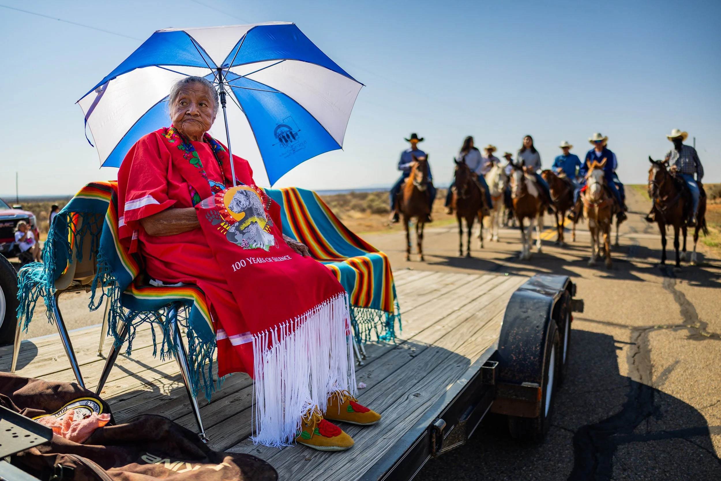 White Mesa Community elder Imogene Pelt holds a blanket that reads “100 Years of Silence” in a parade to celebrate the White Mesa Bear Dance in the White Mesa Ute community, located directly adjacent to the Bears Ears National Monument, on Saturday, Aug. 30, 2025. The 100 Years of Silence project involved artists and Ute Mountain Ute tribal members sharing a part of the White Mesa Ute community’s past that hadn’t been talked about: the Posey War. In 1923, the state of Utah waged the final war in U.S. history against a tribe, known as the Posey War.