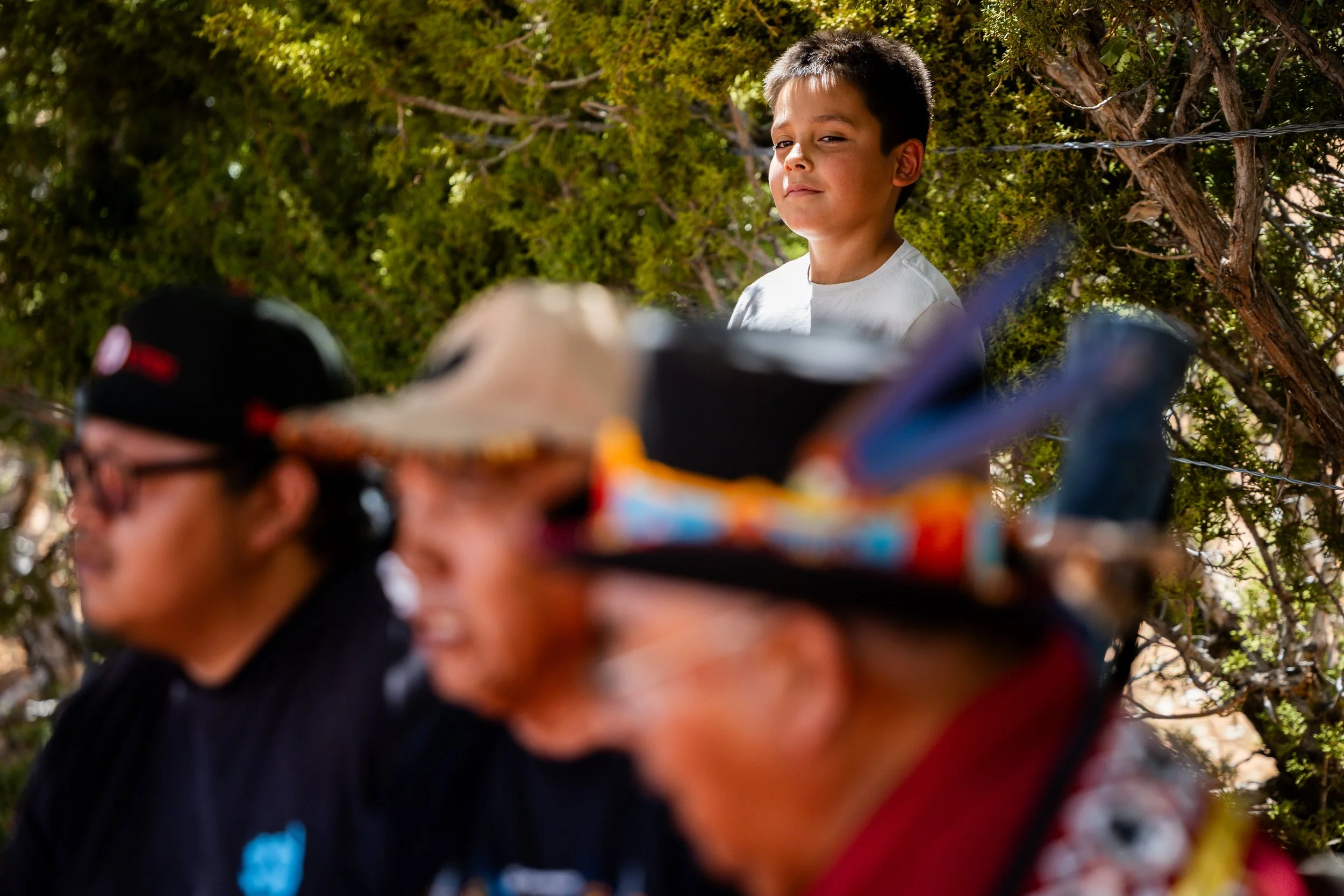 Liam Yarbrough, 10, watches as bear dance chiefs sing and use growlers, instruments played with sticks to imitate growls and spring thunder, symbolically waking the bears from hibernation, during the White Mesa Bear Dance in the White Mesa Ute community, located directly adjacent to the Bears Ears National Monument, on Saturday, Aug. 30, 2025.