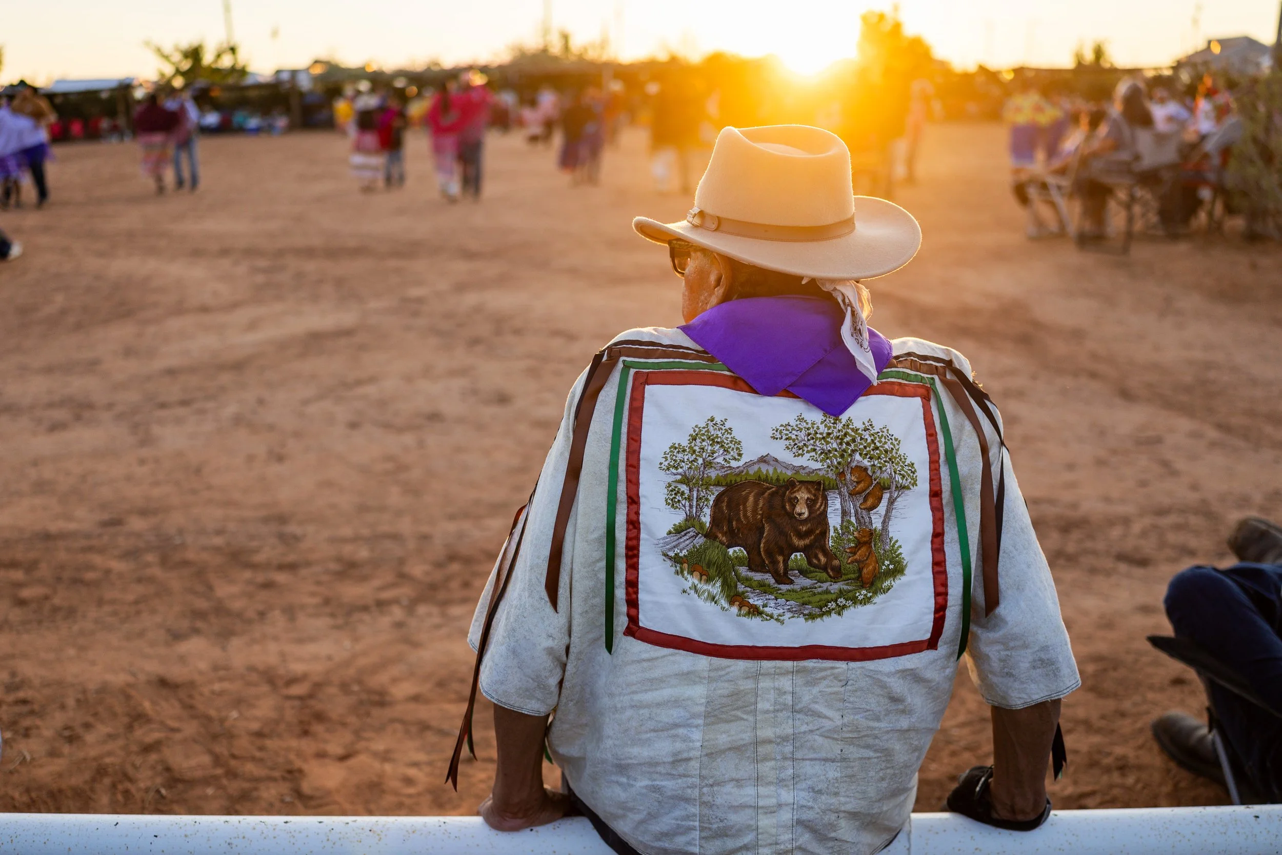 Aldean Ketchum, Ute Mountain Ute elder and bear dance chief of 40 years, wears a shirt representing the bear dance while watching people participate in the White Mesa Bear Dance in the White Mesa Ute community, located directly adjacent to the Bears Ears National Monument, on Sunday, Aug. 31, 2025.